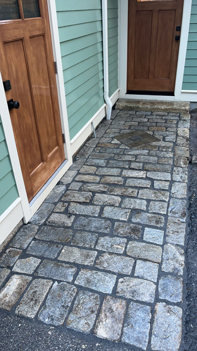 Granite steps rebuild, as well as removal and reset of the cobblestone walkway.